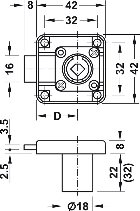 Ohišje pohištvene ključavnice Hafele 232.26.600 je dimenzije 42 x 42 mm, premer cilindra ključavnice je 18 mm. Dolžina cilindra je 22 mm in je predvidoma namenjena za iveral debeline 18 ali 19 mm. Ključavnico se privijači z ivernimi vijaki debeline 3.5 mm. Cilinder je odmaknjen od konca ključavnice 25 mm. Poleg ohišja je potrebno dokupiti cilinder (2x ključ) in zunanjo rozeto. Pri tej ključavnici se ključ za zaklep obrne na desno.